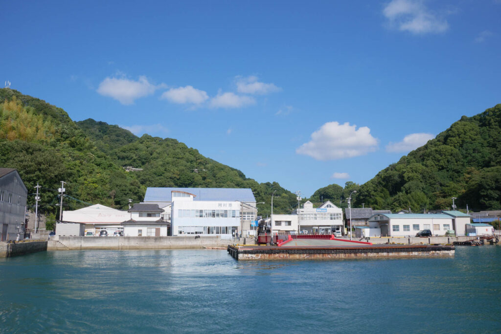 岡村島着。9時35分のフェリーで今治へ渡ります。
