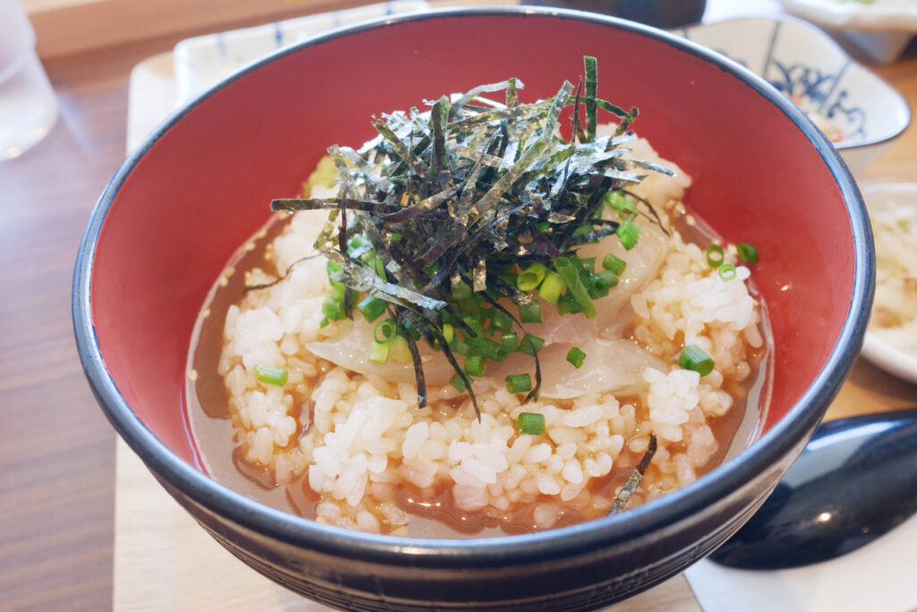 だし醤油と溶き卵に漬かった鯛の刺身をご飯にかけて、ひつまぶしのようにして食べます。